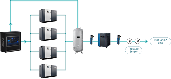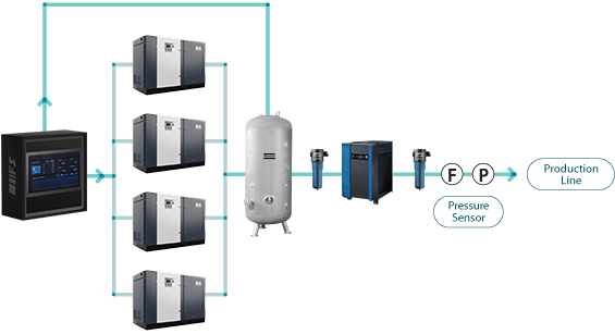 통합제어시스템은 공장 압축공기의 소요량을 실시간으로 감시하여 공기 압축기를 최적의 조건으로 가동, 정지, 제어 함으로써